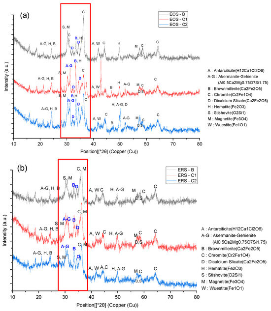 To investigate the structural characteristics of the modified slags, X-ray diffraction (XRD) analysis was performed for EOS-B, EOS-C1, EOS-C2, ERS-B, ERS-C1, and ERS-C2, and the results are shown in Figure 7. The slag samples exhibited a complex mixture of amorphous and crystalline phases, including chromite (C), kermanite–gehlenite (A–G), dicalcium silicate (D), and brownmillerite (B), with some overlapping peaks observed among these phases.