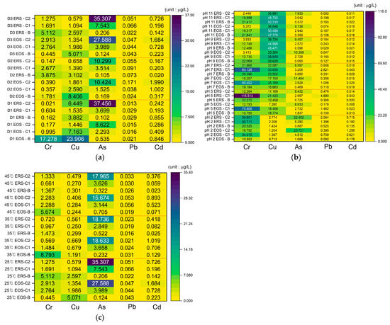 In the particle size experiments, the maximum concentrations observed were Cr 17.28 μg/L (D1, EOS-B), Cu 7.16 μg/L (D1, EOS-C1), and As 35.31 μg/L (D1, ERS-C2). However, no clear trends were observed based on the particle size and modification status. Cr was found predominantly in the pH 2–7 range, with a peak concentration of 115.51 μg/L at pH 5 (ERS-C1). Cu concentrations increased at pH ≥ 7, with values reaching 45–50 μg/L on average at pH 11. Arsenic showed relatively low concentrations overall, with a mean value of 6.90 μg/L, even though elevated values were observed in some modified samples: 23.72 μg/L (pH 2, EOS-C2) and 22.40 μg/L (pH 2, ERS-C2). These levels remain extremely low compared to the naturally occurring arsenic concentrations in the soil (~15 mg/L) [42].