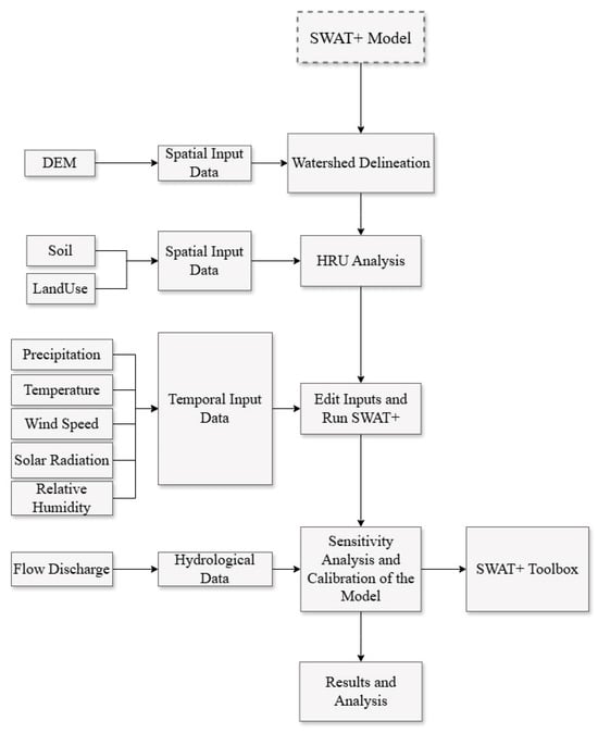Hydrological models are effective tools for understanding, predicting, and managing water resources [25]. Modeling studies have advantages for analyzing water resource-related problems and aid in the development of solutions to current and prospective issues for long-term management of water resources. The Soil and Water Assessment Tool (SWAT) model and its upgraded version, SWAT+, are extensively used hydrological models utilized to understand the impact of land use, land cover changes, and climate change on water bodies over large and complex watersheds. The SWAT+ model incorporates detailed land management practices, improved simulation of landscape and hydrological processes, and better representation of land use/land cover (LULC) effects [26]. The model’s ability to integrate spatial data, such as soil characteristics, topography, climate, and LULC, makes it an ideal tool for assessing hydrological responses to LULC changes at the watershed scale. Studies have shown that SWAT+ can effectively simulate the hydrological impacts of urbanization, deforestation, and agricultural practices on watershed hydrology [27].