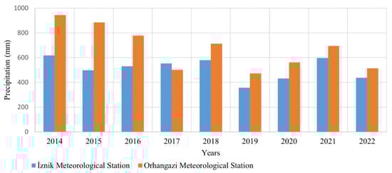 Among the three meteorological stations located within the basin (İznik, Bursa Radar, and Orhangazi), the İznik station was utilized in this study due to its more comprehensive and continuous data availability. Figure 4 shows the yearly total precipitation distribution of two stations: data from 2014 to 2022 for the İznik and Orhangazi stations.