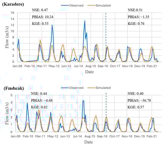 The comparison of observed and simulated flow during the calibration and validation periods for each gauging station is illustrated in Figure 6 with the calculated error statistics. Based on the statistical metrics, PBIAS values fall within the “Very Good” range, except for the validation period at the Fındıcak station. KGE ranges from 0.53 to 0.76, indicating “Satisfactory” to “Good” performance during calibration and validation. The NSE values were 0.47 and 0.51 for the Karadere station, indicating “Satisfactory” model performance, while they were 0.44 and 0.40 for the Fındıcak station. The results suggest a model performance ranging from satisfactory to very good based on PBIAS and KGE values. However, NSE values at the Fındıcak station were slightly below the recommended threshold of 0.50. This may be attributed to uncertainties in precipitation input data, as the İznik meteorological station is located close to the Karadere gauging station but far from the Fındıcak station, potentially leading to lower model performance at the latter.
