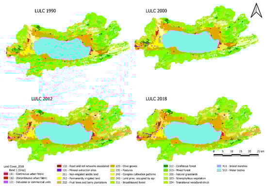 LULC map of the İznik Lake Watershed for the years 1990, 2000, 2012, and 2018.