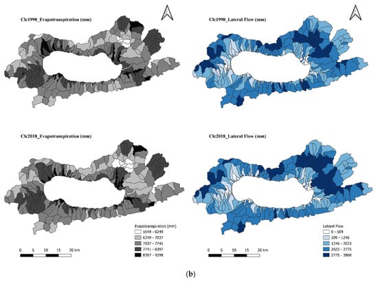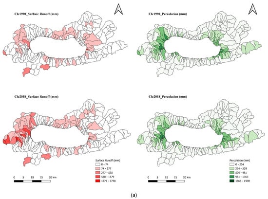 (a) Spatial distribution of surface runoff and percolation under the Clc1990 and Clc2018 land use scenarios. (b) Spatial distribution of evaporation and lateral flow under the Clc1990 and Clc2018 land use scenarios.