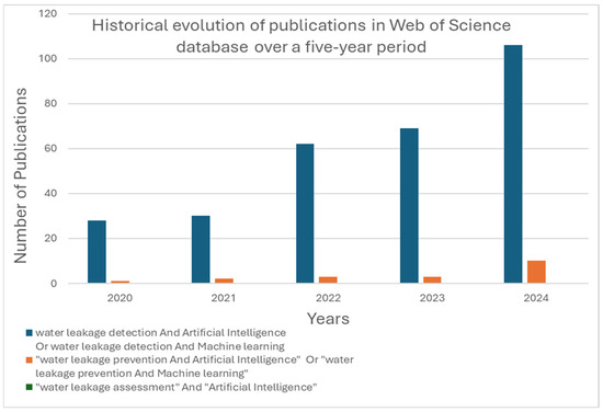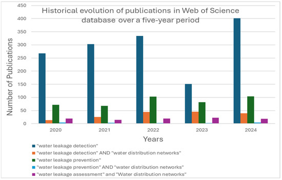 Four keyword phases were designed to map the research landscape from foundational topics to specific intersections. Phase 1 established the baseline of water leakage research across detection, prevention, and assessment. The keyword “water leakage detection” gave a total publication of 4085 which further reduced to 1657 after selecting the range between 2020 and 2024. As shown in Figure 2, the annual breakdown is 268 in 2020, 303 in 2021, 334 in 2022, 351 in 2023, and 401 in 2024, which shows a growing interest in water leakage detection. Upon refining the search to “water leakage detection AND water distribution networks”, 297 results were identified, with 171 publications appearing between 2020 and 2024:14 in 2020, 26 in 2021, 45 in 2022, 46 in 2023, and 40 in 2024. In contrast, the search for “water leakage prevention” yielded 1470 publications in total, with 429 of these published within the 2020–2024 timeframe: 72 in 2020, 68 in 2021, 103 in 2022, 82 in 2023, and 104 in 2024. Within the context of water distribution networks “water leakage prevention AND water distribution networks” only yielded 28 publications overall, with 15 from the period 2020–2024: four in 2020, three in 2021, two in 2022, two in 2023, and four in 2024. Finally, the query “water leakage assessment AND water distribution networks” resulted in 234 total publications, with 97 recent ones: 20 in 2020, 15 in 2021, 20 in 2022, 23 in 2023, and 19 in 2024.