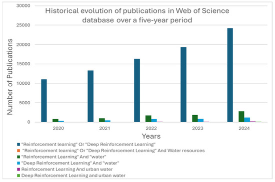 Phase 3 examined the broader application of reinforcement learning in water systems. As shown in Figure 4, the search for “Reinforcement Learning AND water” returned 11,032 total publications, with 8198 from 2020 to 2024: 777 (2020), 1011 (2021), 1697 (2022), 1888 (2023), and 2823 (2024). To narrow down, we selected research areas related to water resources, which left only 139 publications: 16 papers for 2020, 15 for 2021, 35 for 2022, 34 for 2023 and 39 for 2024. The query “Deep Reinforcement Learning AND water” yielded a total of 4210, including 3601 recent publications—323 (2020), 445 (2021), 777 (2022), 846 (2023), and 1210 (2024) which, when introducing the research area of water resources, further reduced to 39 publications. The next keyword combination, Reinforcement Learning AND urban water,” had 624 results, with 482 in the recent period: 37 (2020), 60 (2021), 96 (2022), 110 (2023), and 179 (2024). Similarly, “Deep Reinforcement Learning AND urban water” returned a total of 374, 307 of which were published from 2020 to 2024: 22 (2020), 34 (2021), 62 (2022), 72 (2023), and 117 (2024).