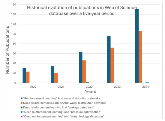 Finally, phase 4 directly targeted the review’s central research gap, as shown in Figure 5. The phrase “Reinforcement Learning AND water distribution networks” produced 439 total publications, with 374 in the 2020–2024 range: 30 (2020), 34 (2021), 63 (2022), 96 (2023), and 151 (2024). For “Deep Reinforcement Learning AND water distribution networks”, there were 299 total results, 267 of which were recent: 23 (2020), 20 (2021), 46 (2022), 72 (2023), and 106 (2024). In contrast, “Deep Reinforcement Learning AND leakage detection” appeared only once in 2022, and “Deep Reinforcement Learning AND water leakage detection” returned zero results across all years. A similar lack of activity was found for “Deep Reinforcement Learning” AND “pressure optimisation Or Leakage prevention” with only one relevant publication in 2024.