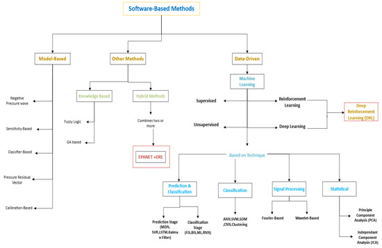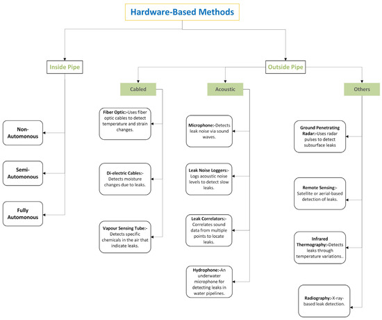 In the literature, the simplest categorisation of leakage detection techniques can be divided into hardware- and software-based methods. The criteria for classifying hardware-based methods are determined by the characteristics of the devices employed, whereas those for software-based methods are based on model-based and data-driven approaches. A detailed hierarchical classification system for leakage detection methods can be found in [10,14].