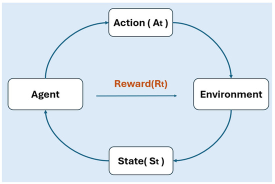 Reinforcement Learning is a type of machine learning in which an agent learns to make decisions by interacting with an environment to achieve a defined goal [50,112,113,114,115,116]. The agent starts without prior knowledge and improves its strategy by receiving feedback in the form of rewards or penalties based on its actions. This trial-and-error learning enables the agent to optimise its behaviour over time by maximising the cumulative rewards [117]. The standard RL framework, illustrated in Figure 9, is typically modelled as a Markov decision process and is closely related to dynamic programming techniques RL has been applied across diverse fields, such as robotics, healthcare, and game-playing, and continues to evolve with recent developments in deep and quantum reinforcement learning [49,98,113].