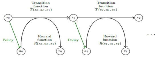 As shown in Figure 10, RL can be considered a Markov decision process (MDP) that involves several elements [50,53,97,117,118,119,120]: a set of states (S) representing possible situations in the environment, a set of actions (A) that the agent can take, the environment dynamics and transition probabilities (P) that determine how actions change the state, the reward function (R) that signals the desirability of state-action pairs, and the discount factor (γ) that determines the weight given to immediate versus future rewards. At each step, the agent is in a state (s0,s1,s2) takes an action (a0,a1) based on its policy, receives a reward (r0,r1), and moves to the next state. The transitions between states are governed by the environment’s dynamics, and the rewards provide feedback for learning. This loop of state → action → reward → next state forms the basis of reinforcement learning.