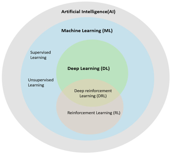 DRL integrates RL concepts with DL techniques, as shown in Figure 11 [16,49,53,98,115,122,123]. It Involves agent learning through interaction with the environment by taking action and receiving feedback in the form of rewards or penalties. This process helps the agent identify valuable actions and develop optimal policies to maximise cumulative rewards. The agent must perceive the current state, evaluate the actions, and understand the consequences to effectively guide decision-making [53,98,114,115]. It helps agents learn effective behaviours through trial and error, using repeated actions, feedback, and rewards to guide their learning. For example, a robot can be trained by attempting tasks, receiving rewards for successful outcomes, refining its actions to maximise rewards, and eventually mastering how to achieve optimal results [16,50,52,108,122]. DRL involves several elements: observed spaces (S), action spaces (At), environment dynamics and transition probabilities (P), reward function (Rt), and discount factor (γ), which balance immediate and future rewards [49,50,53,98,115]. The agent observes the initial environment state (S1), selects a policy, performs an action, and receives a reward. This process is iterated to determine the optimal policy through trial and error. A visual illustration of this process is shown in Figure 12. Unlike traditional RL, which uses tabular data, DRL incorporates a deep neural network, which is a key distinguishing feature [22]. Further details on the DRL architecture and processes are available in various studies [16,49,50,51,52,53,98,115,122,123].
