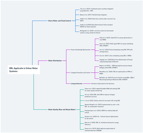 DRL has had a transformative impact across numerous fields by effectively solving complex problems and advancing sequential decision-making capabilities. Compared to other industries, DRL is gaining popularity in the urban water sector. Figure 13 provides a summary of the reviewed literature where DRL has been utilised in urban water networks.
