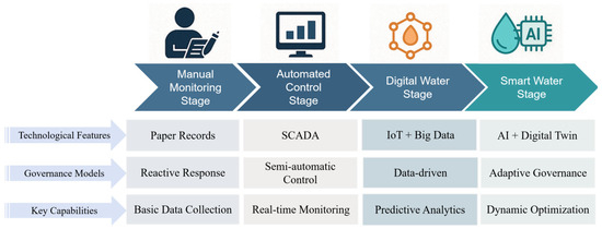The evolution of water management systems reflects a broader transformation in urban infrastructure, shifting from reactive and manual operations to intelligent, data-driven governance [7]. This transition is driven by increasing urbanization, climate pressures, and the need for sustainable resource use. Scholars have identified several developmental phases that illustrate how water organizations have adapted to these changes, including: