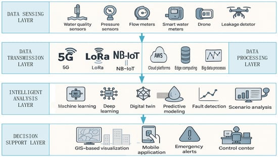 At its core, SWM leverages tools such as the IoT, AI, big data analytics, and digital twin modeling to enable real-time monitoring, predictive maintenance, and adaptive decision-making. One of the most promising innovations in SWM is the adoption of intelligent digital twins, which allow for the creation of virtual replicas of physical water systems. These models support simulation-based planning, optimization, and risk assessment, thereby enhancing operational agility and supporting strategic planning over time [5]. Furthermore, AI and big data have shown significant potential in enhancing water quality prediction, leak detection, and demand forecasting, offering scalable solutions for both developed and developing regions [6].