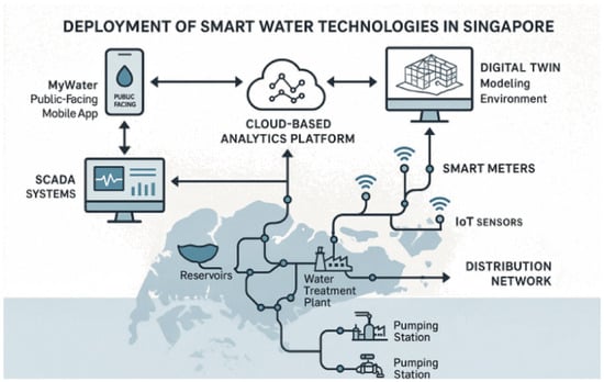 Today’s water systems are increasingly defined by the adoption of AI, cloud computing, and digital twin modeling, enabling real-time decision-making, predictive analytics, and adaptive control [11,12]. These innovations support dynamic resource allocation, early leak detection, and scenario-based planning, significantly improving system functionality and ecological robustness.