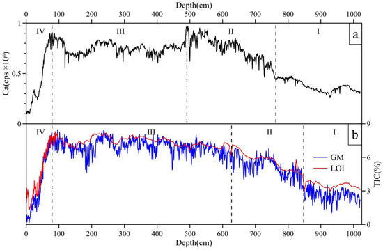 The total inorganic carbon (TIC) content of the YZH-1 core, assessed using both the GM method and the LOI method, ranges from 0.14% to 8.47% and from 1.34% to 8.30%, respectively, with average values of 5.47% and 5.61%. Measurements obtained via the LOI method are generally slightly higher than those derived from the GM method. Both methodologies exhibit similar trends and can be categorized into four distinct stages (Figure 2b): Stage I (1020–845 cm) displays the lowest and most stable TIC concentrations in the core sequence, with the GM and LOI measurements averaging 2.6% and 3.5%, respectively. During Stage II (845–626 cm), both methodologies document a progressive enrichment in the carbonate content, with values increasing from 3.1% (GM) and 4.5% (LOI) to 5.6% (GM) and 7.1% (LOI). The subsequent Stage III (626–86 cm) maintains the highest TIC levels throughout the core, characterized by fluctuating values averaging 7.0% (GM) and 7.5% (LOI). Finally, Stage IV (86–0 cm) exhibits an abrupt depletion in inorganic carbon, with both techniques recording near-zero values—the minimum observed in the entire borehole profile.