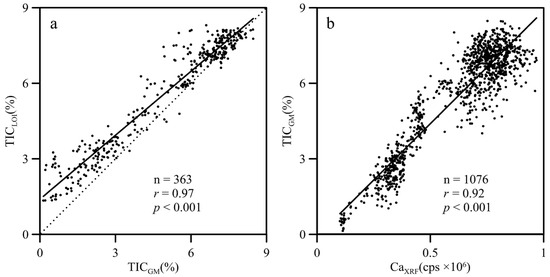 Correlation analysis diagrams. (a) Correlation analysis between GM method and LOI method measurements; (b) correlation analysis between Ca element scanning intensity and TIC values determined by GM method.