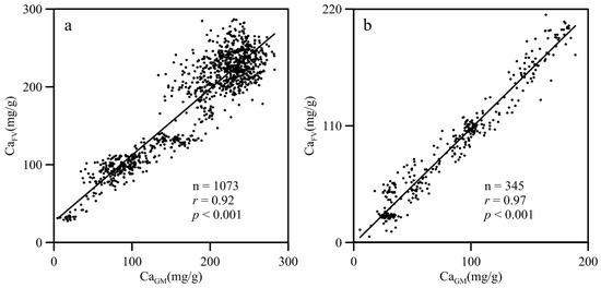 Correlation analysis between measured Ca values and quantitatively converted values. (a) Lake Yangzong; (b) Lake Fuxian.