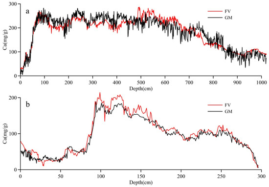 Variation curves of measured Ca values and quantitatively converted values. (a) Lake Yangzong; (b) Lake Fuxian.