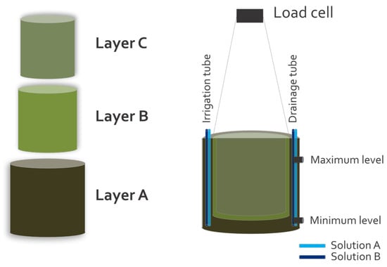 Layer A (bottom layer) consisted of a 15 L plastic container, where the nutrient solution volume was controlled by two electronic level sensors.