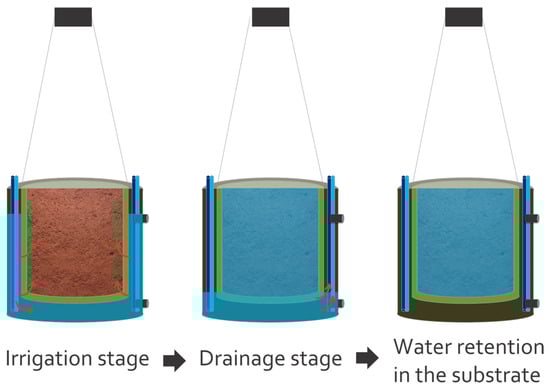 The first weighing of the system was performed five minutes after the end of the drainage cycle, which allowed sufficient time for the residual gravitational water to drain completely. The second weighing was carried out immediately before the activation of the irrigation in the following cycle, i.e., 55 min after the drainage cycle. The difference between the two weight measurements was considered the volume of water consumed by the plant during that cycle, assuming no water losses due to evaporation or leakage.
