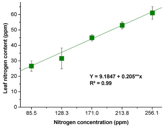The relationship between the leaf nitrogen content in tomato plants and the nitrogen concentration of the nutrient solution. Bars represent standard deviation (±SD). Asterisks indicate statistically significant differences: p < 0.01 (**).