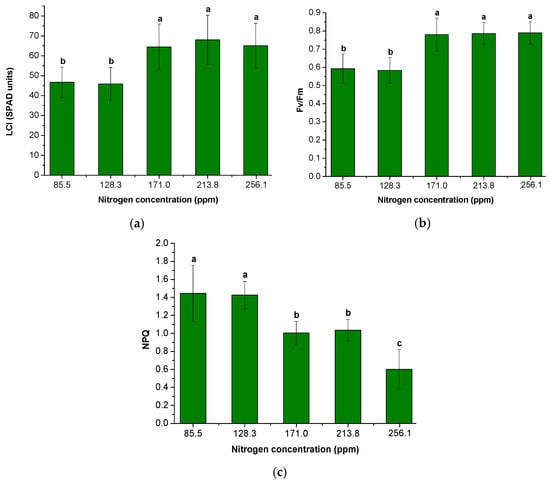The LCI and Fv/Fm were significantly higher when the N concentrations in the nutrient solution were 171, 213.8, or 256 ppm compared to N concentrations of 85.5 or 128.3 ppm (Figure 5a,b).
