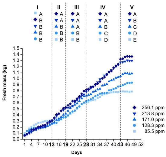 Starting from day 43, which marks the onset of Phase V, all treatments differed significantly from one another. The highest N concentrations (213.8 ppm and 256.1 ppm) consistently produced the greatest fresh mass, whereas the lowest concentrations (85.5 ppm and 128.3 ppm) resulted in the smallest values. This hierarchical response pattern remained stable until the conclusion of the experiment.