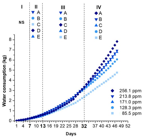 During the initial days, variation in the water consumption among the treatments was observed. From day 7, marking the beginning of Phase II and the end of Phase I, the treatment with 213.8 ppm N exhibited the highest water consumption, differing significantly from the others.