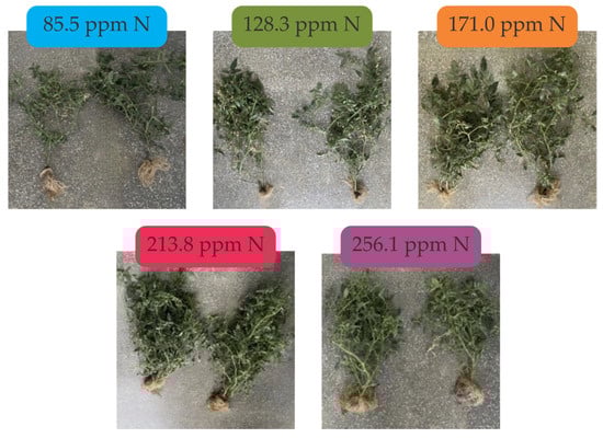 Visual differences in biomass accumulation among treatments were clearly observed at the end of the vegetative stage. As shown in Figure 8, tomato plants grown under increasing nitrogen concentrations exhibited distinct morphological development, with visible increases in their shoot and root biomass as the N availability increased. The most vigorous growth was observed at 213.8 and 256.1 ppm N, while plants grown under 85.5 and 128.3 ppm showed visibly smaller structures.