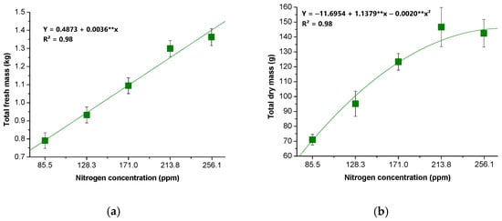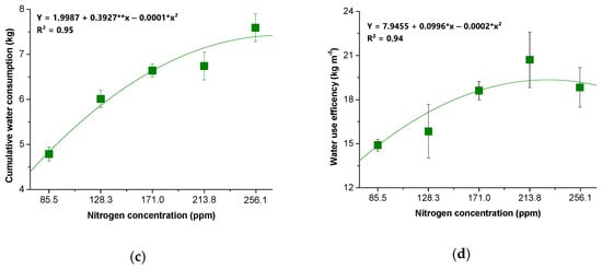 There were strong positive curvilinear relationships between the N concentration of the nutrient solution and the total plant dry mass (Figure 9b), cumulative water consumption (Figure 9c), and water use efficiency (Figure 9d). The greatest plant dry mass and water use efficiency were observed at the second highest N concentration, in the nutrient solution of 213.8 ppm (Figure 9b,d), whereas the maximum response for cumulative water consumption was observed at the highest nutrient solution N concentration of 256 ppm (Figure 9c).