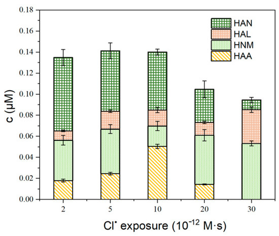 The concentrations of chloroacetonitriles exhibited a consistent decrease as the Cl• exposure rate increased from 2 to 30 × 10−12 M·s. Initially, at 2 × 10−12 M·s, chloroacetonitriles were present at a concentration of approximately 0.07 µM. This concentration gradually diminished, reaching about 0.01 µM at the highest exposure rate of 30 × 10−12 M·s. This trend suggested that higher exposure rates might either promote the degradation of chloroacetonitriles or inhibit its formation. Chloroacetaldehyde concentrations remained relatively stable across the range of exposure rates studied. At 2 × 10−12 M·s, chloroacetaldehyde was present at about 0.02 µM, and this value did not significantly change as the exposure rate increased to 20 × 10−12 M·s. The slight increase observed at the highest exposure rate might indicate a minor enhancement in chloroacetaldehyde formation or a slight decrease in its degradation rate under these conditions. The concentration of chloronitromethanes initially decreased with increasing exposure rates, reaching a minimum at 10 × 10−12 M·s, where it was approximately 0.02 µM. Beyond this point, the concentration of chloronitromethanes began to increase, reaching about 0.05 µM at 30 × 10−12 M·s. This biphasic pattern might reflect changes in the competitive reactions involving chloronitromethane formation and degradation at different exposure rates [34,35]. Chloroacetic acid concentrations initially increased with increasing exposure rates, peaking at around 0.05 µM at 10 × 10−12 M·s. Subsequently, the concentration of chloroacetic acids decreased to zero at 30 × 10−12 M·s. This trend suggested that chloroacetic acid formation was favored at intermediate exposure rates, possibly due to optimal reaction conditions for its formation or reduced degradation at these levels.