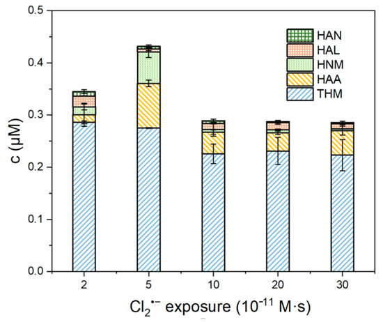 The formation of disinfection by-products (DBPs) generated through radical-mediated interactions between dichloride radicals (Cl2•−) and Suwannee River natural organic matter (SRNOM) was also investigated [36,37]. The concentration profiled of five DBPs under varying Cl2•− exposure (0−30 × 10−11 M·s) are illustrated in Figure 2. The total DBP concentration initially increased sharply, reaching a peak of approximately 0.43 μM at a Cl2•− exposure of 5 × 10−11 M·s, and then gradually declined to 0.3 μM at 30 × 10−11 M·s (Figure S4). This trend reflected the rapid formation of DBPs at lower exposures, followed by their degradation or transformation at higher Cl2•− concentrations [38]. This trend suggested that DBP formation is transient, with initial rapid generation followed by degradation under prolonged Cl2•− exposure.