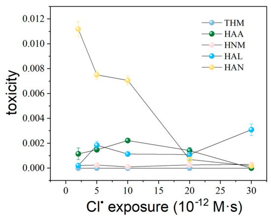 The initial surge in toxicity at 2 × 10−12 M·s exposure was likely due to the rapid formation of chloroacetonitriles, which was a highly reactive and toxic DBP. As the Cl• exposure increases, the concentrations of chloroacetonitriles significantly decreased. The decrease in overall toxicity beyond 2 × 10−12 M·s could be explained by several mechanisms. Firstly, at low Cl• concentrations, the concentrations of chloroacetonitriles and chloroacetic acids were higher and their toxicities were also higher. As Cl• exposure increased, the concentrations of chloroacetonitriles and chloroacetic acids decreased. Therefore, it was inferred that the decreases in toxicities may be due to the decrease in chloroacetonitriles and chloroacetic acid concentrations. Secondly, the competitive reactions among different DBPs might lead to the formation of less harmful compounds or their degradation products (Figure S5). The stabilization of toxicities at 20 × 10−12 M·s suggested that the system might be approaching saturation, where most of the organic precursors had reacted and the formation of new toxic DBPs was limited [46,47].