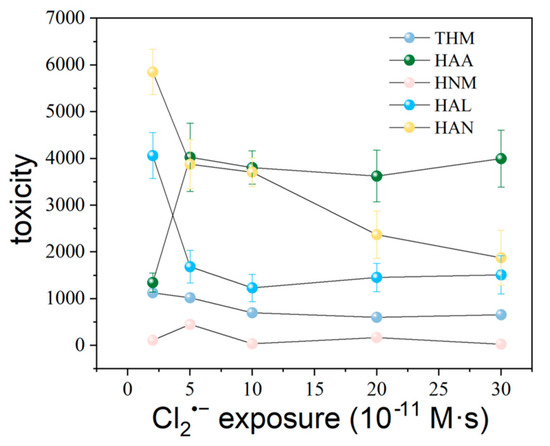Figure 4 illustrates the toxicity levels associated with different dichloride radicals’ (Cl2•−) exposure. At zero exposure, the toxicity was negligible, indicating that there were no significant toxic effects without Cl2•− exposure. Upon exposure to 2 × 10−11 M·s, there was a sharp increase in toxicities, which can be attributed to the substantial generation of chloroacetonitriles and chloroacetaldehydes. At this exposure level, the highest concentrations of chloroacetonitriles were observed, suggesting that chloroacetonitriles contributed most significantly to the observed toxicities. As the exposure rate increased further, the overall toxicities decreased significantly. When exposure reached 20 × 10−11 M·s, the toxicities leveled off and stabilized. At this stage, the contributions of chloroacetic acids to the toxicities became predominant. This trend suggested that chloroacetic acids were more stable or less reactive under higher exposure conditions compared to chloroacetonitriles, which might degrade or transform into less toxic compounds [47].