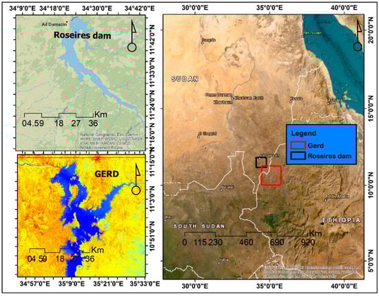 GERD holds immense hydrological significance, as it directly influences the flow and distribution of water resources within the Nile River Basin [30,31]. The Blue Nile, originating from Lake Tana in Ethiopia, contributes a substantial portion of the Nile’s water volume. With the construction of the Ethiopian Renaissance Dam, the study area has become a focal point for water resource management, presenting both opportunities and challenges for downstream countries [32,33,34].