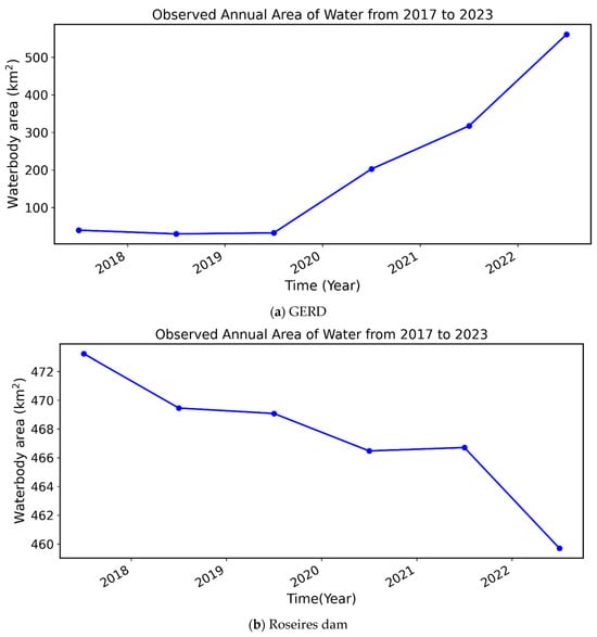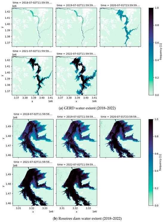 Water mapping: (a) GERD from 2018–2022, and (b) Roseires dam from 2018–2022.