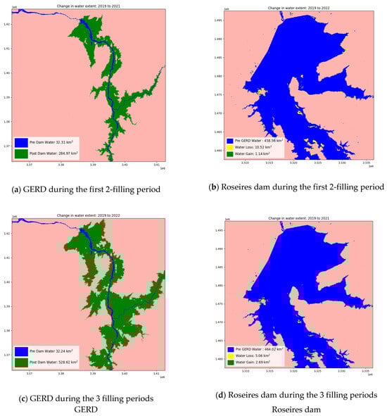 In the same timeframe, Roseires dam experienced a decrease in water extent area of approximately 5 km2, while gaining around 3 km2. However, during the third filling period, both GERD and Roseires dam underwent significant changes in water extent area. The water area of GERD expanded from approximately 284–528 km2, resulting in a total gain of 244 km2. In contrast, Roseires dam experienced an increased water loss, going from 5 to 10 km2 (Figure 4 and Figure 5)