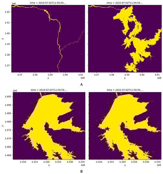 Map showing the difference in water extent in 2019 and 2022: (A) GERD, (B) Roseires dam.