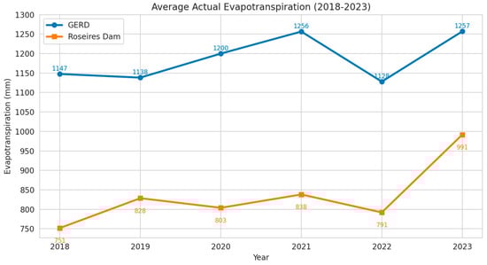 The variation of evapotranspiration for the study areas is shown in Figure 6 below. Between 2018 and 2023 the average actual evapotranspiration at both GERD and Roseires Dam followed a broadly similar arc: an initial rise, a mid-period peak, and a dip in 2022. GERD consistently showed higher values—roughly 350–400 mm above Roseires each year—indicating greater atmospheric water loss in its catchment. GERD dipped slightly from 2018 to 2019, surged to a maximum of about 1250 mm in 2021, then eased back to roughly 1130 mm in 2022 and reached its local maximum of 1257 mm in 2023. Roseires climbed from about 750 mm in 2018 to 830 mm in 2019, slipped to 800 mm in 2020, reached near 840 mm in 2021, and fell to roughly 790 mm in 2022 and which then rose to its peak, 991.7 mm in 2023. The synchronized peaks and subsequent declines suggest common regional climatic influences.