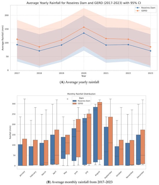 The Average rainfall for GERD and Roseires Dam: (A) average yearly rainfall, (B) average monthly rainfall (2017–2023).