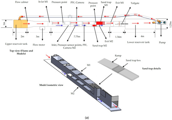 Schematic layout of the experimental setup of the pressurized square tunnel inside and outside the flume showing (a) models M1, M2, PIV, instrument and sand trap positions, (b) models M3, M4, PIV, instrument and sand trap positions.
