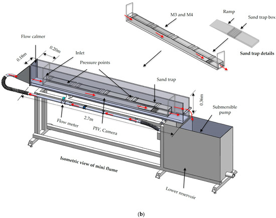 Water circulation was maintained through two interconnected reservoir tanks operating in a recirculating closed-loop system. Both the inlet and outlet of the conduit were connected to the hydraulic reservoirs via circular pipes with an outer diameter of 0.2 m (Figure 2a). The mini flume was also integrated into a recirculating closed-loop system (Figure 2b), utilizing a lower reservoir tank equipped with three submersible pumps and a flow control valve.