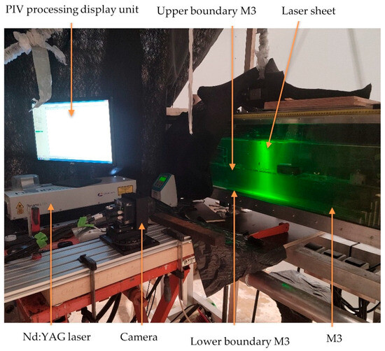 One 4-megapixel CCD (charge-coupled device) cameras captured particle images at a frequency of 20 Hz for 3 min per discharge condition, yielding a total of 3600 image pairs. These images were processed using TSI’s Insight 4G software in three stages: pre-processing (enhancing particle clarity), processing (defining interrogation window size and overlap), and post-processing (interpolating and correcting bad vectors). Instantaneous velocity fields were obtained through statistical cross-correlation of paired images, separated by a time delay Δt (1–10 ms). Figure 3 illustrates the PIV setup, and Figure 4 presents a sample raw image and resulting vector field for model M3.