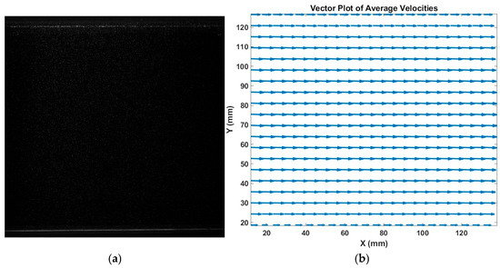PIV images samples of model three (M3) (a) Raw image showing seeded tracer particles; (b) processed magnified velocity vector field obtained via cross-correlation of particle displacements.