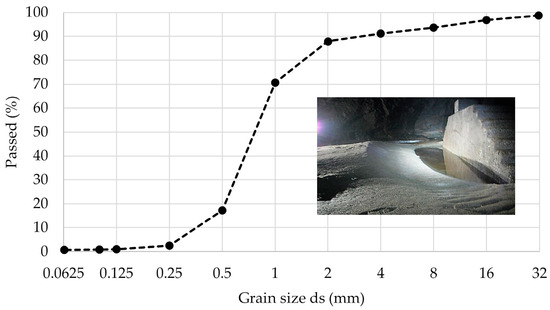 The selected sand particles, within the specified grain size range, have a specific gravity of 2.65. Based on sieve analysis, sand grains in the 0.075–2 mm range (Figure 5) were specifically targeted for sediment distribution, based on sediments scaling though approximately 80% of the trapped sediment mixture falls within 0.5–2 mm ranges. This grain size distribution closely aligns with a previous study [3]. The amount of sand used in each test was determined based on the volume available beneath and between the ribs in the sand trap section. To ensure consistent sediment transport throughout the study, each test was conducted with a sand volume corresponding to 74% of the total capacity of the sand trap. Sediments were introduced into the model using a funnel at the inlet of each model experiment and prototype, with sand quantities of 1024 g, 128 g, 24 g, and 3 g placed into six individual cups for models M1, M2, M3, and M4, respectively.