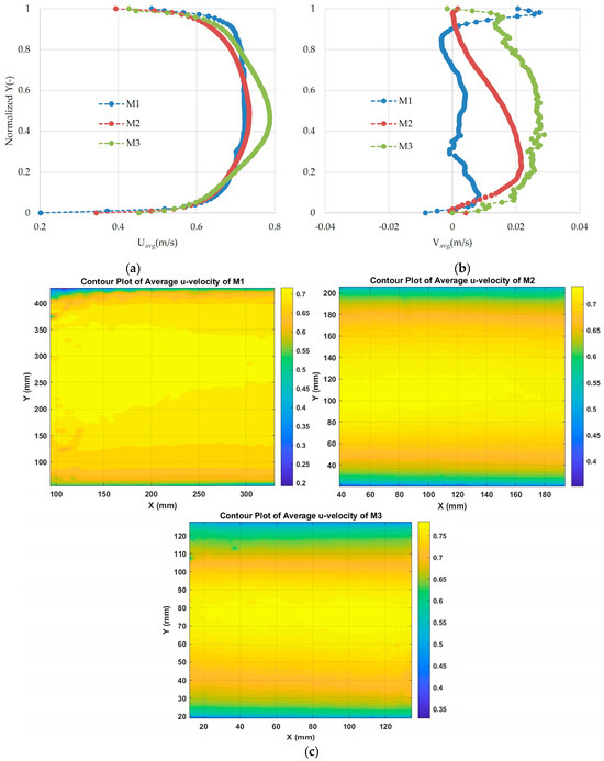 Comparison of particle image velocimetry (PIV) flow profiles for the three models: (a) horizontal flow velocity component; (b) vertical flow velocity component; (c) average flow field in the x-direction represented as a contour plot.
