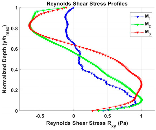 Figure 7 presents the Reynolds shear stress () profiles obtained from time averaged PIV measurements across the tunnel height for the three scaled models (M1, M2, and M3). The raw data obtained was post-processed to remove outliers and local spikes. Noisy vectors exceeding a threshold of 0.01 in the u′ and v′ were replaced using moving average filter with linear interpolation. The results indicate a consistent trend: as model scale decreases, the magnitude of Rxy increases near the bed. The prototype model (M1) exhibits a relatively balanced profile with less intense shear stress gradients, while the smaller-scale models (M2 and M3) exhibit sharper, more pronounced stress gradients concentrated near the wall. This behavior suggests enhanced near-wall turbulence and momentum transfer in M2 and M3, corresponding with the increased sediment mobilization observed during experiments.