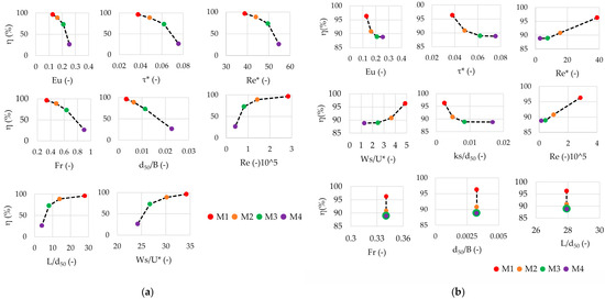 Figure 8 illustrates the influence of dimensionless parameters on trap efficiency in the hydraulic models under 1:1 velocity and sediment scaling (Uavag = 0.661 m/s, d50 = 1.25 mm) and Froude and sediment geometric sediment scaling. The results of Figure 8a indicate that as the model size decreases, an increase in the Euler number (Eu), Shields parameter (τ*), Particle Reynolds number (Re)*, and Froude number (Fr) leads to a reduction in trap efficiency. Conversely, an increase in the Reynolds number (Re), the ratio of rib spacing to particle size (L/d50), and the ratio of sediment settling velocity to shear velocity (Ws/U*) corresponds to an improvement in trap efficiency as the model size increases. The results from Froude scaling in Figure 8b shows that the effect of Euler number (Eu), Shields parameter (τ*), relative roughness (ks/d50) on trap efficiency between the models is low and the trap efficiency is somewhat even closer to each other in M2, M3 and M4 compared to 1:1 scaling results. The Particle Reynolds number (Re)*, relative settling velocity (Ws/U*), and Reynold number (Re) with those the trap efficiency increases with increasing model size from M4 to M1and their effect on model trap efficiency similarity is low in comparison with 1:1 scaling. Unlike to 1:1 scaling the Froude number, relative diameter (d50/B) and the ratio of rib spacing to particle size (L/d50) are similar in all the models with a better and close trap efficiency among the scale models. In general, these opposing trends underscore the significant influence of dimensionless parameters on achieving similarity in trap efficiency across the model series.