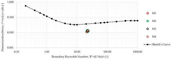 Incipient motion tests were conducted along the centerline of each model, using a scaled sediment bed volume at the conduit invert. Incipient motion was defined as the point at which more than five sediment particles were observed to move according to [28]. In this study, the incipient motion was achieved at an average threshold flow velocities of 0.31 m/s in M1 and M2, 0.30 m/s in M3, and 0.29 m/s in M4 with corresponding head loss measurements of 0.89 mm, 0.99 mm, 1.09 mm, and 1.11 mm, respectively. However, M1 exhibited bed shear stress approximately 12% lower than the other models, indicating a slight deviation from perfect similarity as shown in Figure 9 where results from M2, M3 and M4 almost closely overlapped.