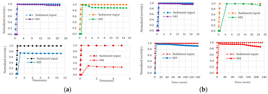 The maximum sediment capacity of the sand traps was measured in terms of the accumulated sediment within the sand traps and the sediment exiting the traps. The measurements were recorded every minute in all the models in the 1:1 velocity and sediment scaling. But in Froude and geometrical sediment scaling measurements were taken every 5-min intervals for model M2 and 10-min intervals for models M3 and M4, using a siphon tube. Dynamic equilibrium was achieved when sediment inflow and outflow were balanced, as Figure 10 illustrates the temporal progression towards equilibrium of the four models. These combination scaling was applied to ensure appropriate scaling of both flow and sediment characteristics within the models.